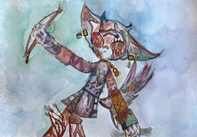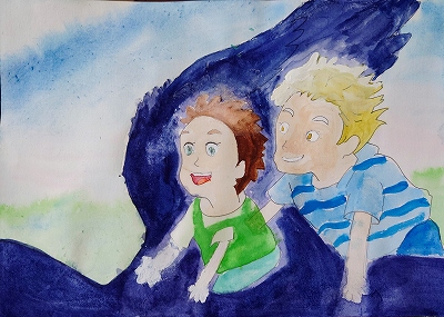 翼の切り取り方が面白いですね。人を描くのも上手になりました!